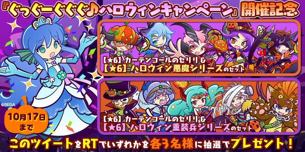 ぷよぷよ クエスト公式 ぷよクエ Twitterissa ぐっぐーぐぐぐ ハロウィン開催記念キャンペーン フォロー Rtで 6 カーテンコールのセリリと 6 ハロウィン悪魔シリーズ もしくは 6 ハロウィン重装兵シリーズ のセットを それぞれ